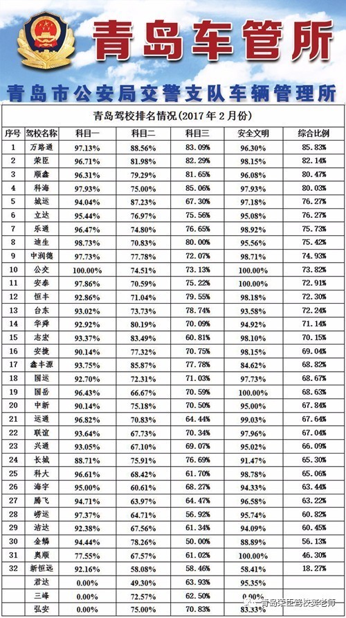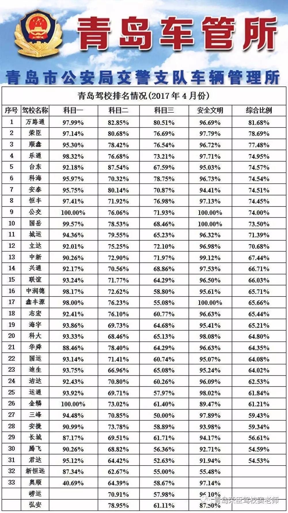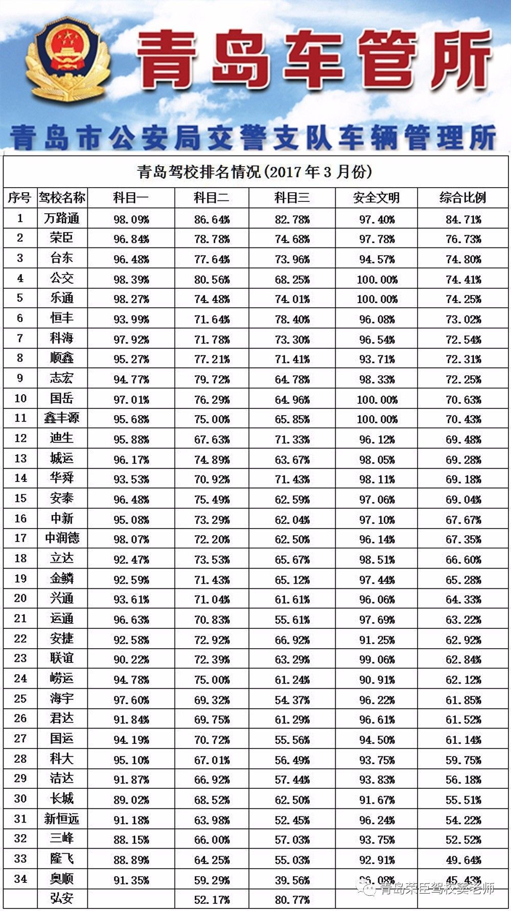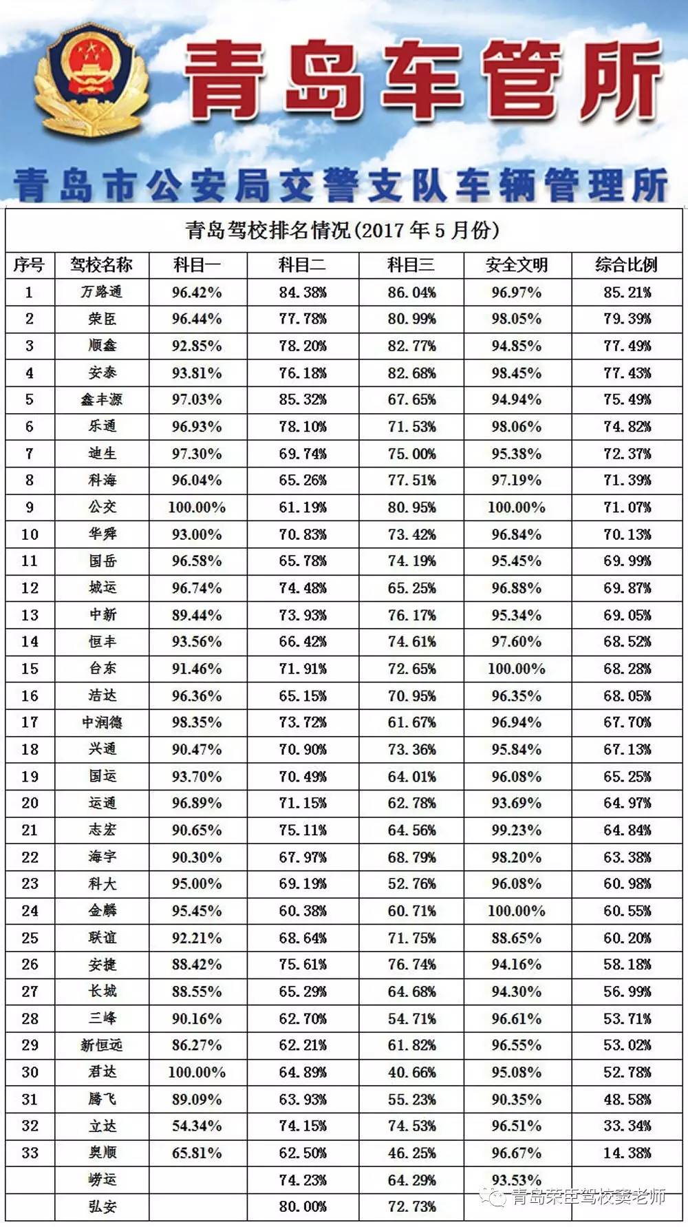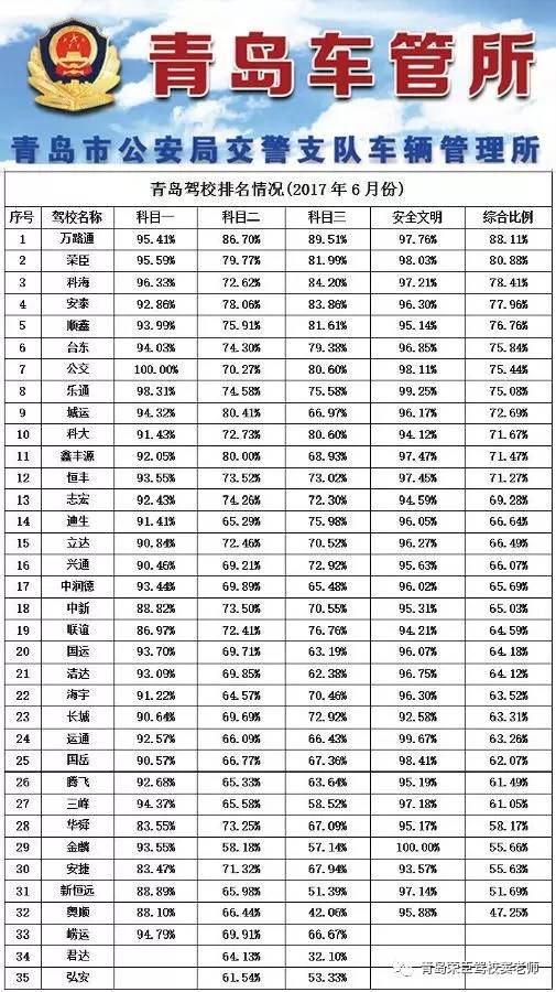官方發(fā)布2017年上半年青島駕校排名!(通過率)
