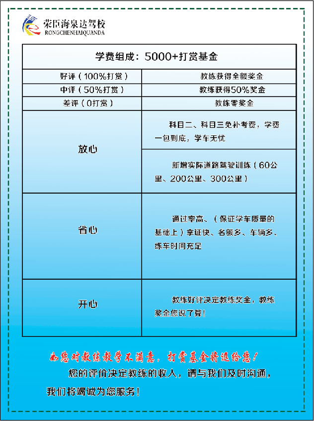 單人單車,車接車送,學(xué)車自主;優(yōu)先學(xué)車,優(yōu)先考試,享受貴賓服務(wù);