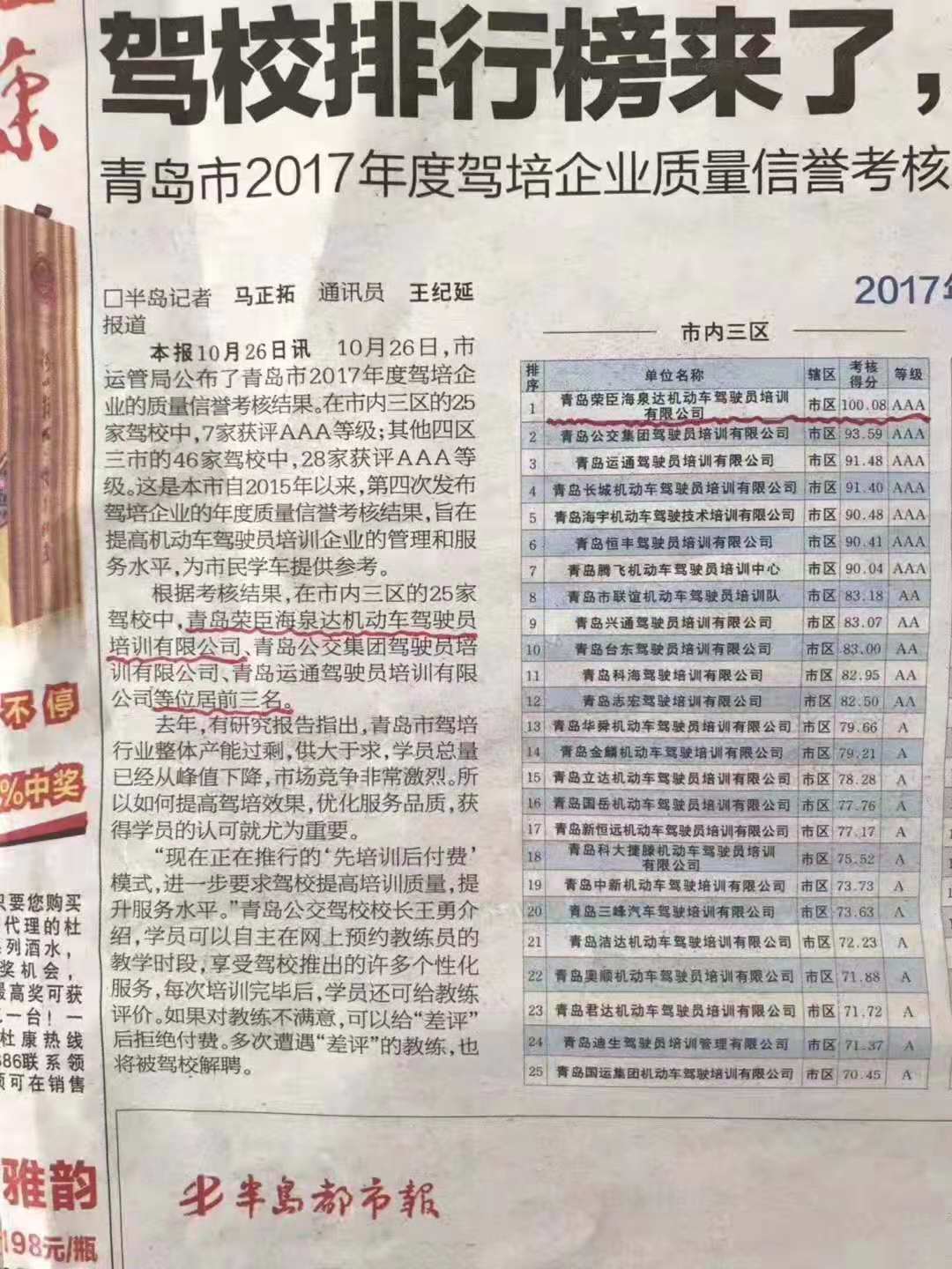 2018年10月27日,半島都市報報道了運管部門公布的2017年青島駕培行業(yè)質量信譽考核分數(shù)和排名。青島榮臣駕校排在第一哦!
