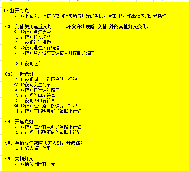 根據(jù)最新下發(fā)的燈光考試文件,考試內(nèi)容去掉了霧燈的有關(guān)內(nèi)容,且燈光由原先的固定模式改為隨機(jī)播報(bào)。夜間燈光考試內(nèi)容: